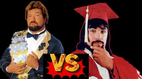 PARTS UNKNOWN, UT ‒ The race to be the next president of pro wrestling came to its final stop last night, as “The Million Dollar Man” Ted diBiase faced “The Genius” Lanny Poffo in their last debate.  Held in the Ultimate Warrior Fine Arts Center at Parts Unknown University, the candidates faced a night of tough questioning from moderator George “The Animal” Steele.