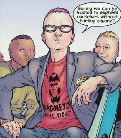 I’ll give you a nerd catch-up on the present. In recent storylines, the mutants have suffered mass genocide at the hands of giant robots, after which the not quite dead Magneto became a Che Guevara t-shirt. His daughter went crazy, created an alternate Happyland where Magneto rules, but then all-but erased mutants, leaving less than 200 on the planet. It’s here where the X-men (who, of course, emerge unscathed) become their most insular and paranoid, dropping almost all greater altruism in favor of keeping the laser beam dodo alive. The team’s heroism becomes more narrow and embattled, focused solely upon events’ effects upon its own people. While this isn’t totally out of line, there’s more than a little persecution complex bigotry here, which ruins the original dream of peace and harmony.